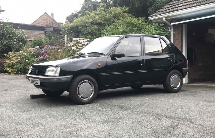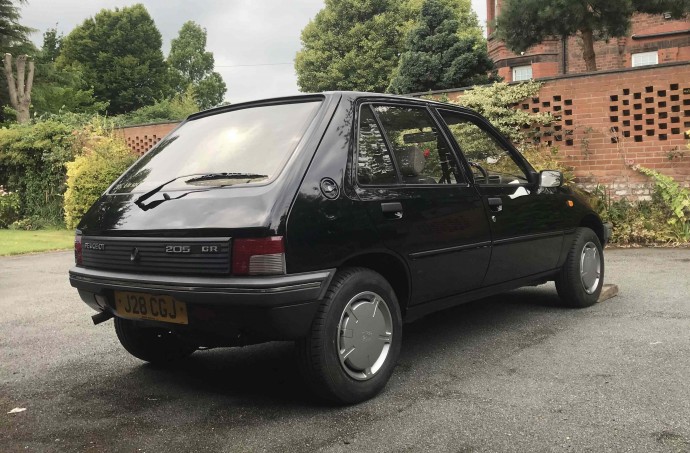 Probably unique Peugeot 205 GR 5-door, in special-order black with 81K genuine miles; with the original buyer until late 2022. One of the last with a manual choke ! Always taxed and tested, with complete history and in daily running order : negligible oil consumption and over 50mpg. Some interior and exterior plastics show their age, but original seats and carpets look good as new. Fault-free MoT until July 2026.